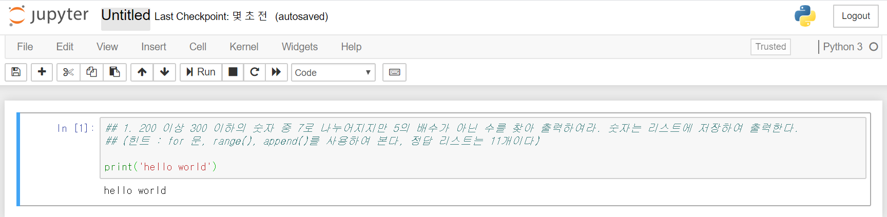 주피터 노트북 로고 옆에 Untitled를 클릭하면 문서의 제목을 바꿀 수 있다.