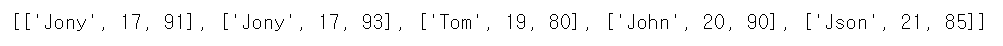 ## (출력예) [['Jony', 17, 91], ['Jony', 17, 93], ['Tom', 19, 80], ['John', 20, 90], ['Json', 21, 85]]