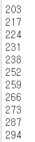 ## 1. 200 이상 300 이하의 숫자 중 7로 나누어지지만 5의 배수가 아닌 수를 찾아 출력하여라. 숫자는 리스트에 저장하여 출력한다.