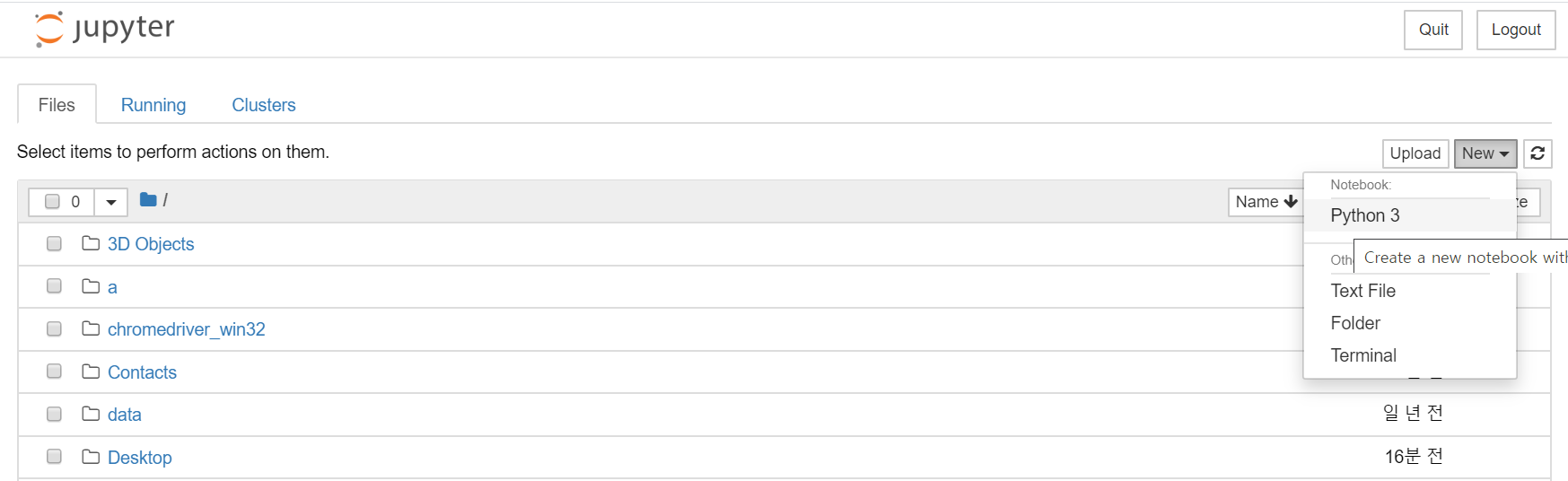 [new]->[python3] 클릭하면, 새 웹브라우저가 열린다.