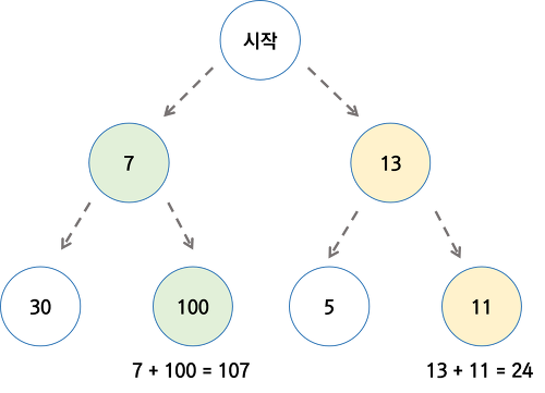 위 그림처럼 그리디 알고리즘을 이용하면 매 순간 가장 좋아보이는 것을 선택하며, 현재의 선택이 나중에 미칠 영향에 대해서는 고려하지 않는다.