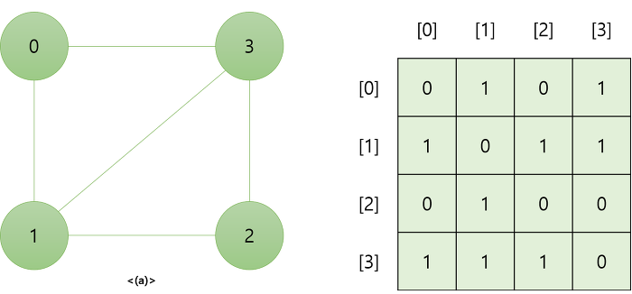 - 개념 : 2차원 배열에 각 노드가 연결된 형태를 기록하는 방식