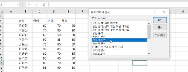 [데이터]-[데이터 분석]-[기술 통계]클릭