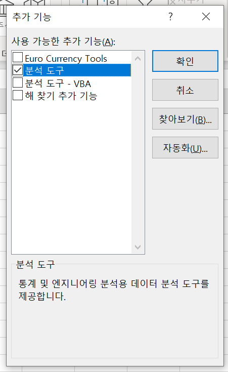 >> [파일]-[옵션]-[추가기능]-[분석도구] 클릭