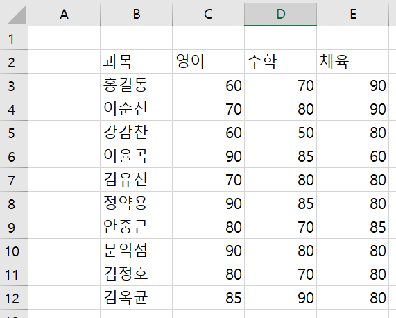 [데이터]-[데이터분석]-[상관분석] (영어/수학상관관계) // 붙어있는 열만 가능한 것 같다.