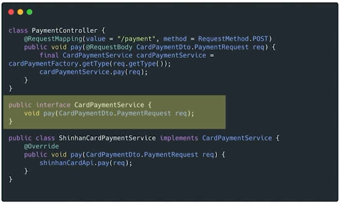 5) DIP 의존성 역전 원칙 : 상위 모델은 하위 모델에 의존하면 안된다. 둘 다 추상화에 의존해야 한다. 추상화는 세부 사항에 의존해서는 안된다. 세부 사항은 추상화에 따라 달라진다. 하위 모델의 변경이 상위 모듈의 변경을 요구하는 위계관계를 끊는다. 실제 사용관계는 그대로이지만, 추상화를 매개로 메세지를 주고 받으면서 관계를 느슨하게 만든다.