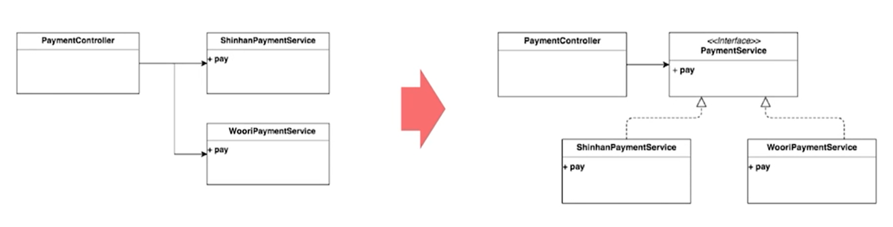 2) OCP 개방-폐쇄원칙 : 소프트웨어 요소는 확장에는 열려 있으나 변경에는 닫혀 있으나 변경에는 닫혀 있어야 한다. 변경을 위한 비용은 가능한 줄이고, 확장을 위한 비용은 가능한 극대화 해야 한다. 요구사항의 변경이나 추가사항이 발생하더라도, 기존 구성요소에는 수정이 일어나지 않고, 기존 구성 요소를 쉽게 확장해서 재사용한다. (추상화, 다형성)