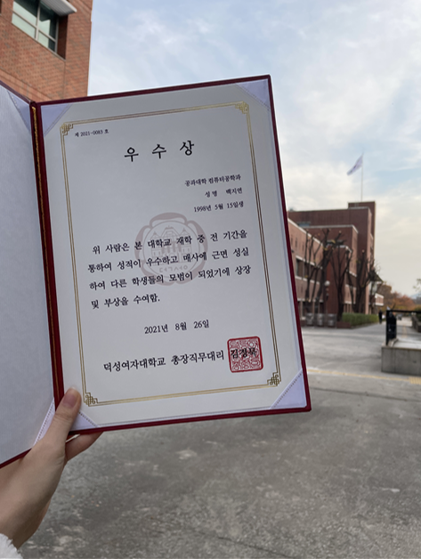 꽃다발 들고, 학사모 던지고 가족과 함께 사진을 찍었다. 아쉽게도 동기들은 다른 날짜에 졸업식을 진행해서 함께 사진을 남기지 못했다. 졸업장 말고 학업 우등상이랑 메달 부상도 받았다. 메달이 진짜 금은 아니겠지만 (진짜 은이라고 한다.) 기분이 좋았다. 대학 생활 4년을 마친 것이 아직도 와닿지 않는다. 사회에서 덕성을 빛내리. 3시간 통학생이었던 나는 나중에 사회인이 되어서 학교에 기부하거나 학교 근처에 기숙사를 짖는데 일조하고 싶은 목표를 가진 적이 있다. 지금 당장은 실천할 수 없지만 언젠가 목표를 실현해보고 싶다.