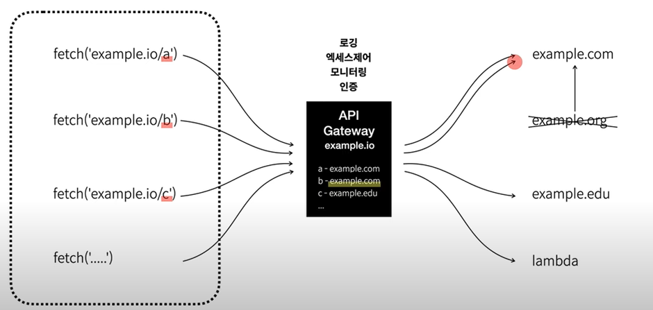 이런 수고를 덜기 위해 API Gateway를 이용할 수 있다. API Gateway는 자신만의 주소(example.io)를 가진다. 그리고 그 주소의 경로별로 어떤 서버로 연결할 지를 결정한다. 서버가 통합되더라도 클라이언트의 어떤 코드도 변경하지 않고 게이트웨이 옵션을 변경하면 모두 잘 동작한다. 람다 사용 시 서버리스 서비스 이용 가능하다.