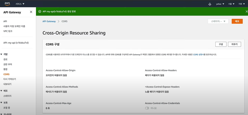 2) 구축 버튼 클릭 – API 이름 생성 – 빈 API 게이트웨이 생성 완료