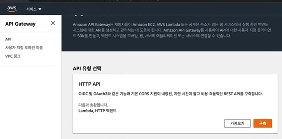 1) 클라우드 콘솔 – API Gateway 검색 – HTTP API 선택