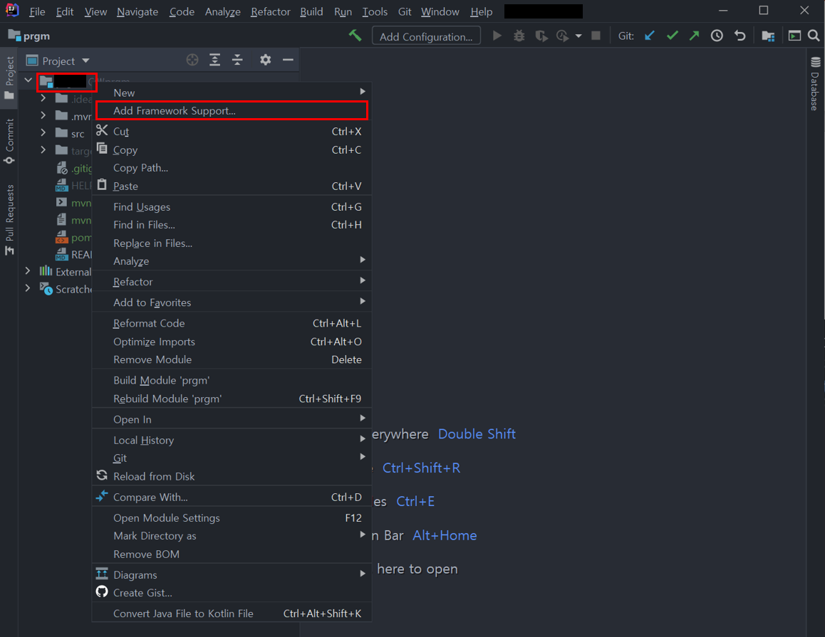 2. 프로젝트 최상단 폴더 - 우클릭 - Add Framework Support 메뉴 클릭