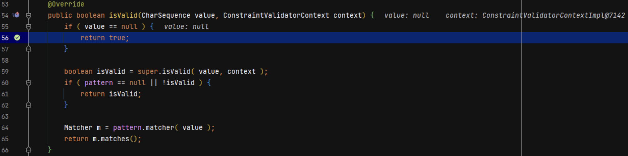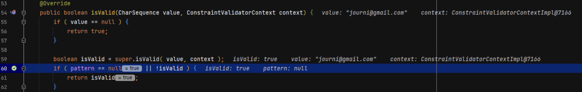 - 정규식이 있으면 부모(AbstractEmailValidator isValid()) 의 기본 정규식으로 검증하고 나서, 자기 자신(EmailValidator isValid()) 의 정규식으로 한 번 더 검증이 이루어진다.