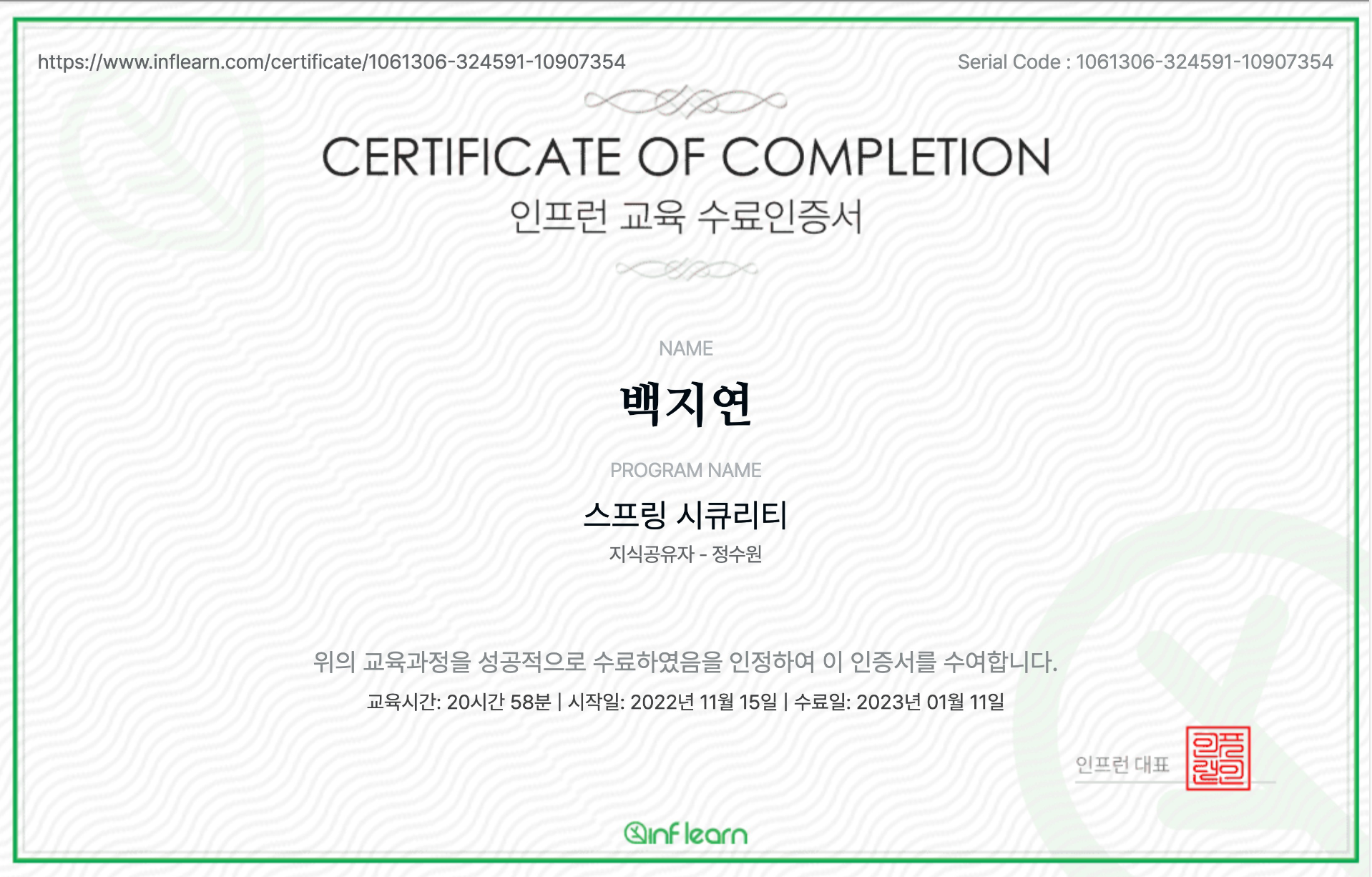 사내 스터디 2기는 자유 주제 스터디로 운영된다고 해서 또 참여했다. 보라 3.0 개발할 때 로그인 토큰 관련 개념이 어려워서 주제를 스프링 시큐리티로 잡았다. 인프런 각자 다른 주제를 공부하고 매주 모여 원페이지로 진행 사항을 공유하는 방식이었다. 서로 분야가 달라서 뭔 내용인지 이해하긴 어려웠으나 원 페이지로 정리해서 말하는 것은 주말에 강의를 열심히 듣게 해 주었고, 공부한 것을 요약하는 계기였다. 2기에는 같은 팀 선배도 스터디에 참여하셔서 더 열심히 임했던 거 같다.