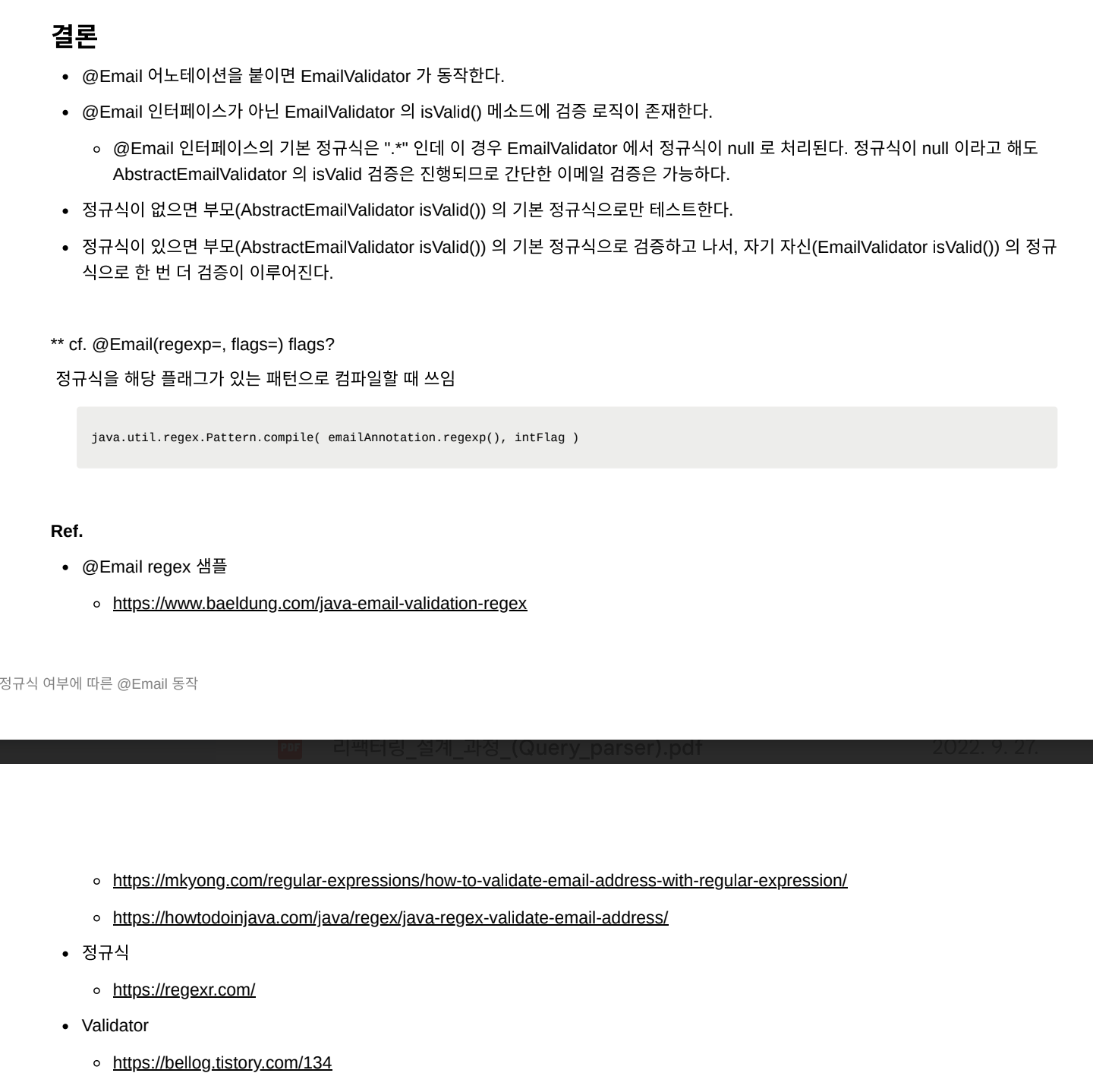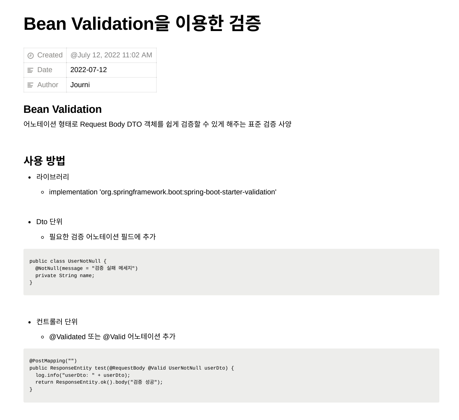 API를 개발할 때 빼놓을 수 없는 것이 입력 파라미터에 대한 유효성 검증이다. 메서드 단위로 일일이 코드를 작성했었는데, Bean Validation R&D를 한번 해보라고 조언해 주셔서 리서치하게 되었다. 어노테이션 형태로 RequestBody 객체를 쉽게 검증할 수 있다는 점이 굉장히 편리하고 가독성을 높여주었다. 입력 파라미터의 특성(숫자, 시간, 문자열 등)에 맞는 어노테이션과 커스텀 방법, 에러핸들링 방법 등을 정리하여 공유했다. 또한 기본 어노테이션 내부를 확인하면서 구성을 파악하려고 노력했던 거 같다. 이런 공유를 자주 해서 팀에 도움이 되어야지 생각했었던 것 같다.