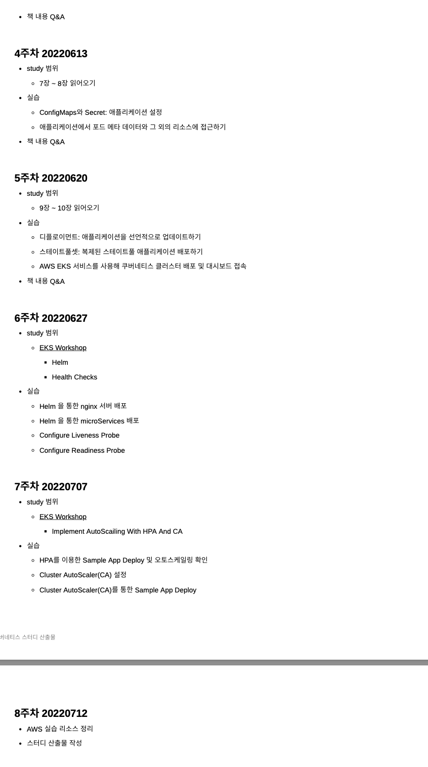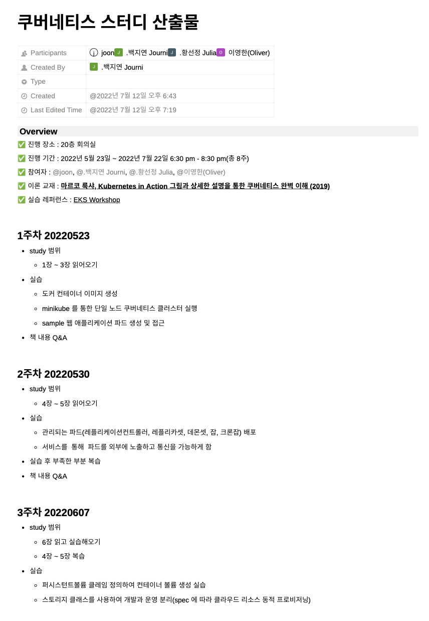 사내 스터디를 시범 운영한다고 해서 바로 참여했다. 백엔드에 가까운 주제는 쿠버네티스 밖에 없어서 인프라 스트럭쳐 쪽이지만 신청했다. 도커에 대한 기본 지식, 필수 명령어만 아는 상태라 러닝커브가 높았다. 회사 타 팀 백엔드 개발자 분들과 매주 1번씩 퇴근하고 쿠버네티스 인 액션 책 개념 파트를 1 회독 한 뒤에 AWS 워크숍을 따라 하며 실습했다. 실제로 팀에 도입하기엔 무리가 있지만 yaml 파일을 이해하고 쿠버네티스 구성요소에 대해 찍먹 하는 경험을 하였다. 이렇게라도 조금씩 공부해 나가는 것이 분명 나중에 도움이 될 것이라 생각한다. 그리고 역시 난 팀으로 하는 스터디가 더 의지가 높아지는 것 같다.