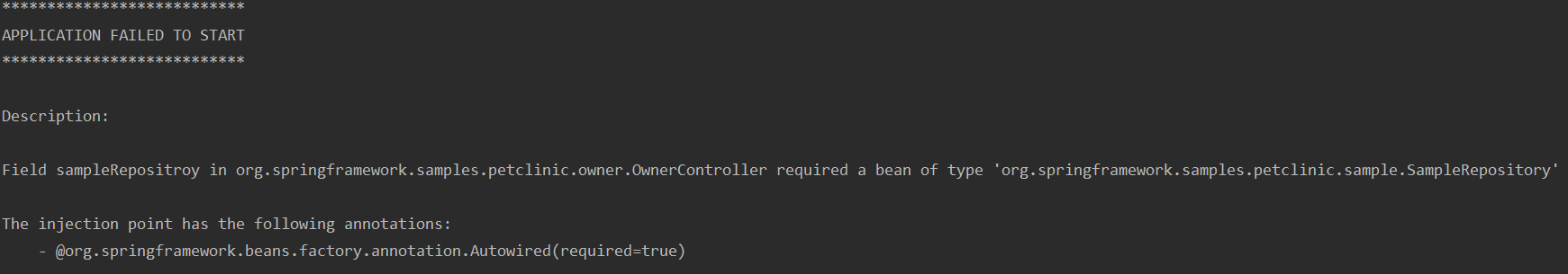 Consider defining a bean of type 'org.springframework.samples.petclinic.sample.SampleRepository' in your configuration.