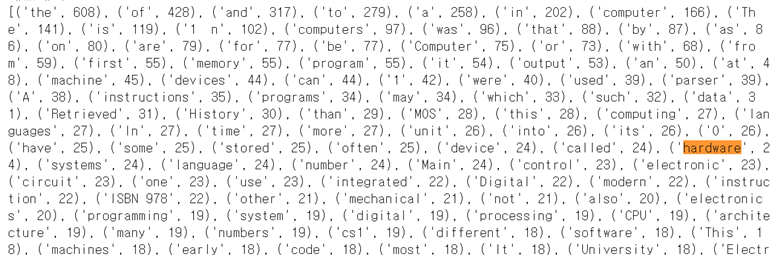위키 데이터의 ‘computer’ 용어 웹페이지 데이터를 받아서 가장 많이 사용되는 단어의 빈도를 찾아본다.