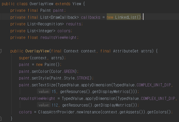 멤버 변수에 callbacks, results, colors 등의 List 객체가 있는 걸 볼 수 있다. 이것들은 model 패키지에 존재한다.
