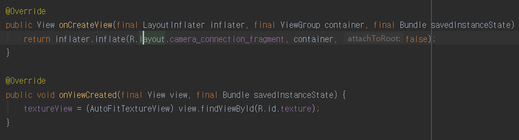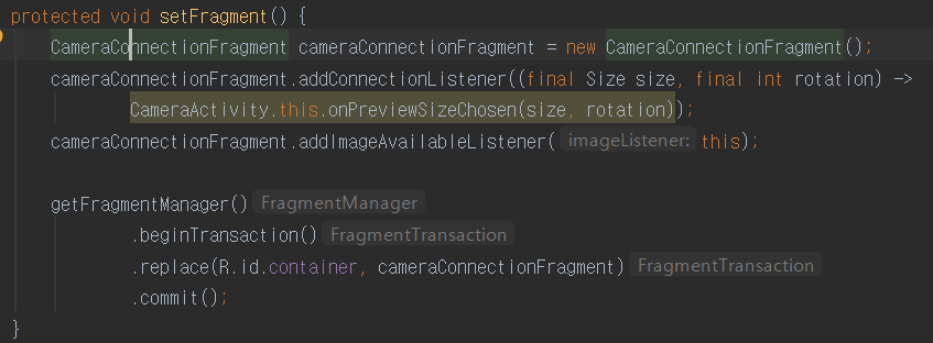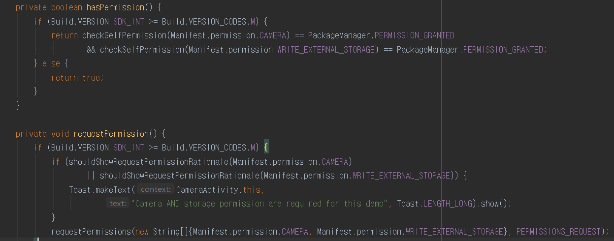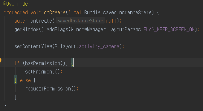 hasPersmission() : 모르겠으면 ctrl+b를 눌러보면 메소드가 정의된 곳으로 화면이 이동된다. 보니 카메라 접근 권한과 관련된 메소드다. 카메라 접근 권한 설정이 되어 있으면, cameraConnectionFragment를 호출한다.