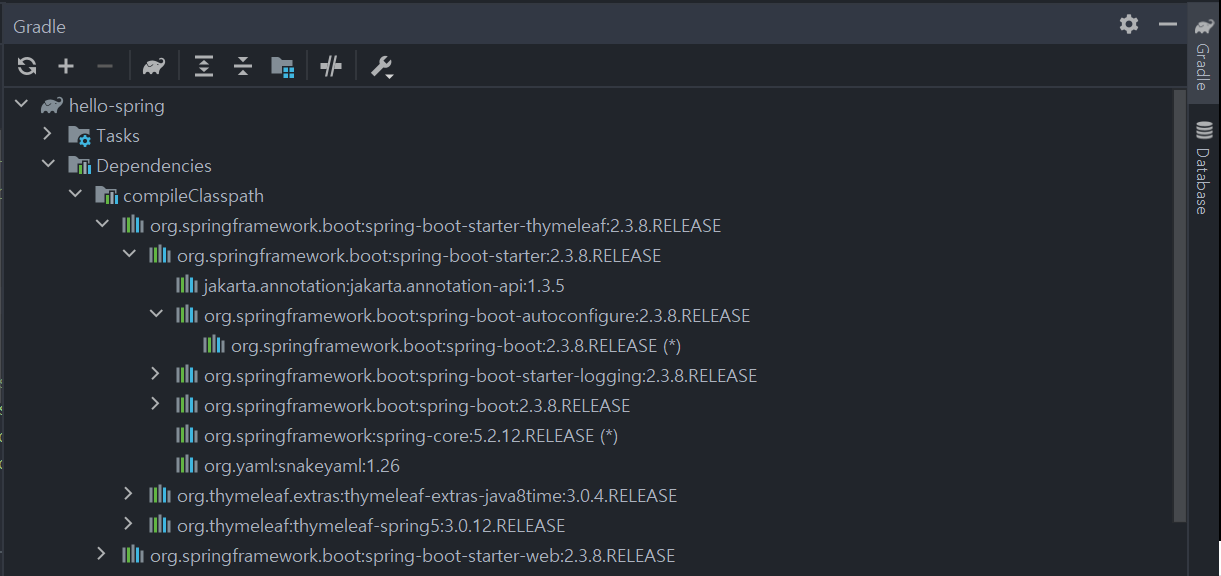 예를들어, 아래 dependencies에서 starter 라이브러리는 thymeleaf, web 라이브러리가 필요합니다. 또 thymleaf 라이브러리 밑에는 또 하위 라이브러리들이 많이 존재하는데, thymleaf 가 필요로 하는 라이브러리들입니다. 요즘에는 톰캣과 같은 웹 서버도 내장된 것을 사용합니다. 예전처럼 톰캣 서버를 직접 다운받지 않고, 라이브러리를 사용합니다. (embeded)