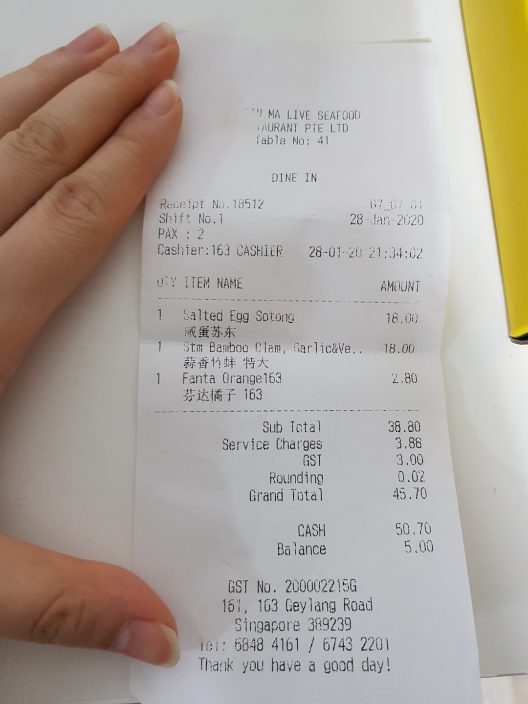 요건 G7이라는 레스토랑에 가서 받은 영수증이에요. Sub total 외에 service charges, gst, rounding 가 있죠? Service charge는 총금액의 10%이고, gst는 7% 입니다. Rounding은 금액에 대해 반올림을 한 내용을 입니다.