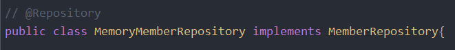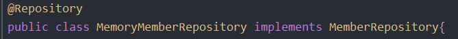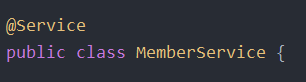 현재 MemberService 클래스는 현재 순수한 자바 클래스라 빈으로 등록되어 있지 않기 때문에 스프링이 알 수 없습니다. MemberService 클래스에 @Service 어노테이션을 붙여줍니다. 또, MemoryMemberRepository클래스에도 @Repository 어노테이션을 추가합니다.
