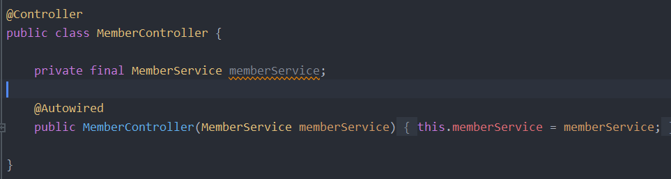 setter은 나중에 호출됩니다. 이 방식은 MemberController 을 호출했을 때, set 메소드가 public으로 열려 있어야 합니다. 어플리케이션 로딩 시점에 한번 세팅되고 나면 이 멤버변수는 바꿀 일이 없는데 public으로 노출되게 된다는 점이 단점입니다.
