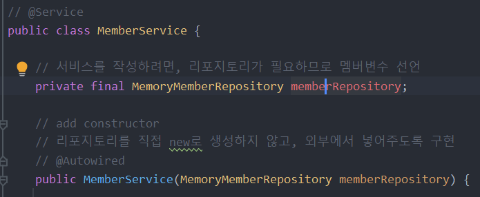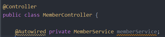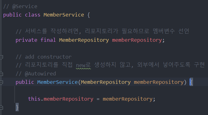 아래처럼 memberController가 생성자에서 memberService 를 @Autowired를 통해 연결했던 것처럼, 서비스 클래스에서도 @Autowired 를 통해 리포지토리를 주입받도록 코드를 수정합니다.