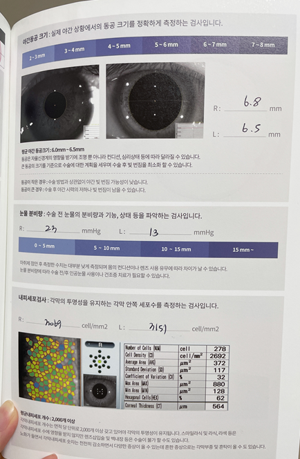 검안이 끝나면, 대기하다가 상담실로 들어가요. 초고도난시, 고도 난시, 각막두께 570, 동공 크기, 눈물 양 평균, 시신경 개수 충분 등등 결과가 담긴 책자를 주세요. 결과적으로 저는 눈은 나쁘지만 각막두께가 여유 있어서 스마일라식/라섹 중에 선택 가능했어요. 전 난시가 심한 경우에 라섹을 하면 통증이나 회복기간이 더 오래 걸린다고 해서 스마일 라식을 선택했고, 추천받은 ㄱㅈㅅ 선생님께 수술 결정했습니다. 나중에 시력이 나빠지면 라섹으로 재수술이 가능하다는 점도 고지해주셨어요.