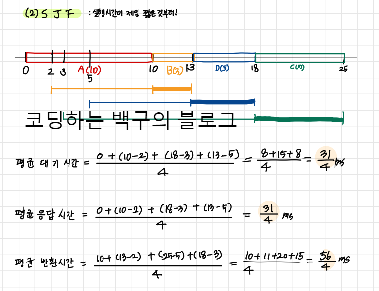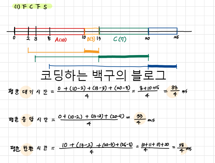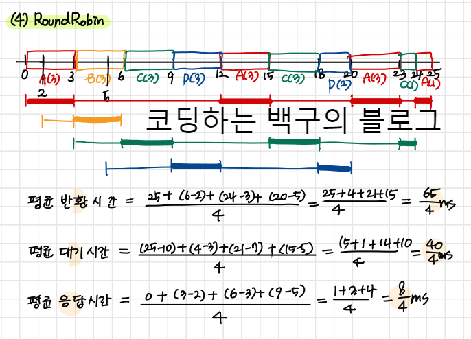 프로세스의 도착시간과 작업시간이 표와 같을 때, 다음 각각의 방법으로 실행하는 경우의 평균 대기시간, 평균 응답시간, 평균 반환시간을 계산하시오. ( 단위 : ms, 타임슬라이스 : 3ms )