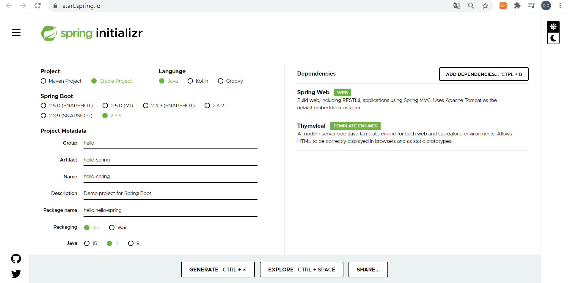 + Spring Web, tymelif(HTML 템플릿 엔진)